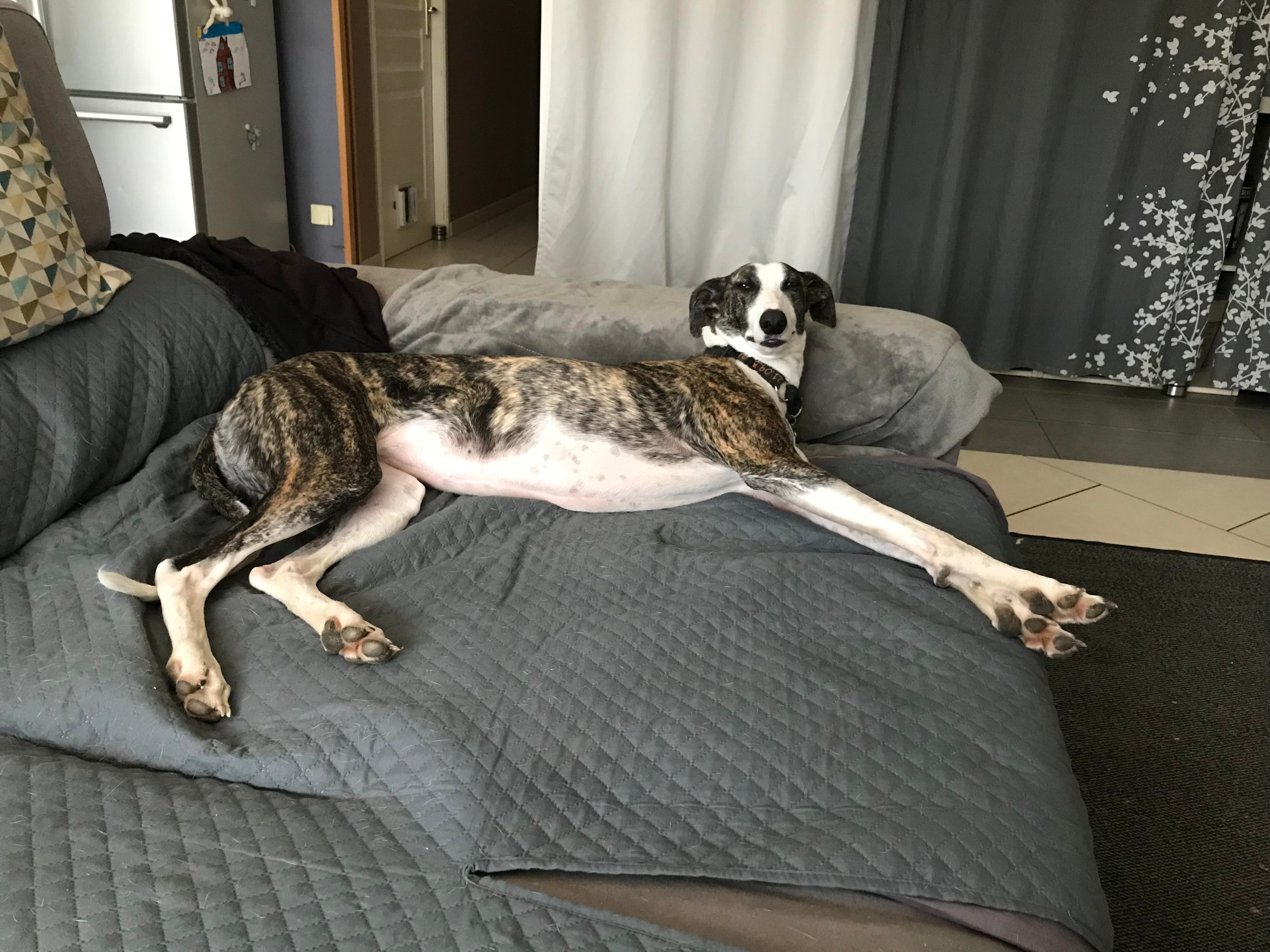 Cette grande et belle galga au regard magnifique s'est parfaitement adaptée dans sa famille d accueil , elle n'a pas de crainte , est joueuse et espiègle , démonstrative et charmante ! Tres en demande de câlins , obéissante et facile . elle vit avec des galgos et des podencos et s entend avec tous . En Espagne elle avait été testée avec chat et ne présentait aucune réaction ,mais depuis qq temps , elle aurait tendance à vouloir jouer de manière un peu brusque avec le chat de la maison et nous préférons le préciser .